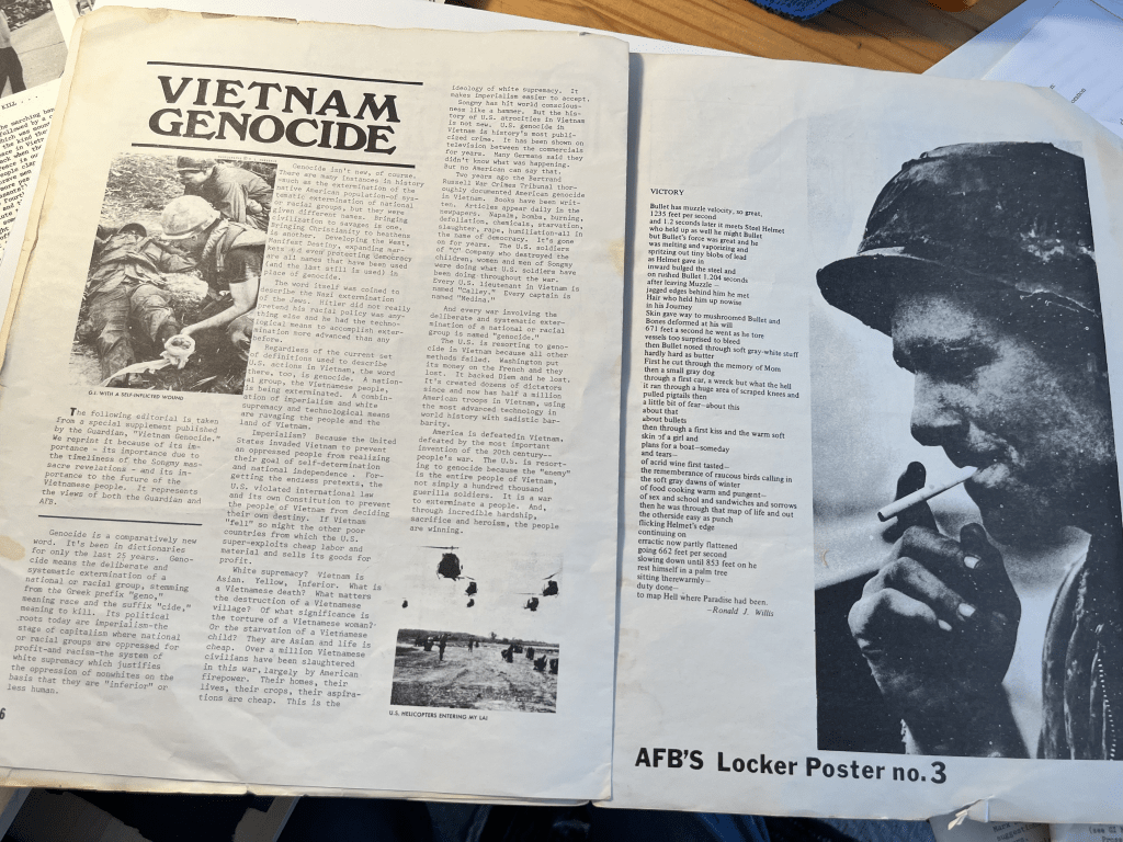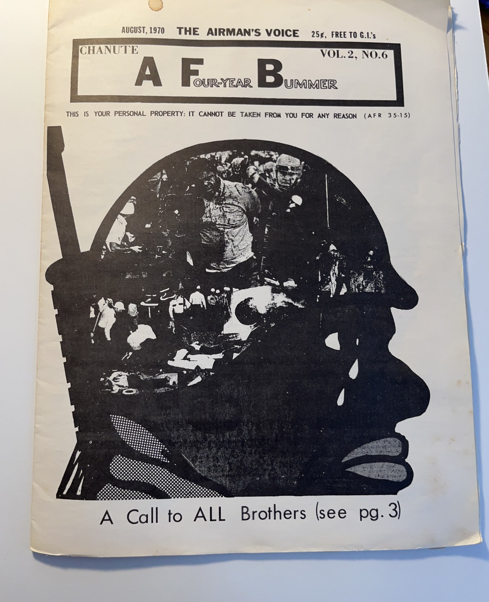 There were two memorable semi-violent incidents: one marked a high point in our effectiveness and the other its bitter end. On the 4th of July, the Left always marched in the patriotic parade with our antiwar contingent which came to include a handful of antiwar airmen. This was allowed as free expression, but only as long as the demonstration didn’t involve any sort of violence. In 1970, the parade organizers tried to entrap us with the help of the police. We were told by the organizers that we would go first. Just west of the corner of Lincoln Avenue on Green Street, police cars blocked us from behind when the parade stalled in front. On cue, angry local men rushed out and tried to seize and destroy our signs and banners. Our people had enough muscle to fight back and hold our ground. The problem was that the servicemen in uniform could no longer participate. Our people fought until the parade moved on with a few of the sulking heavies straggling along with us. Meanwhile, I led the airmen with signs and banner via short cuts and back streets. We arrived before the parade and occupied a space between its route and the reviewing stand. We were right under the nose in the line of sight of General Knapp, the invited AFB commander. The incident made for an edition of the paper that was eagerly received and read at the base gates. The whole thing was fun and it convinced airmen that they had little to fear. Later there were disturbances on the base, instances of an Armed Forces insurrection that historians see as a significant factor in stopping the war, ending the draft, and pressuring the government to transition to a volunteer army. We could claim that we did that. We certainly contributed to it, but I’m not sure now that we had any real agency. We were like a surfer riding a cresting wave who gets a spurious sense of controlling the flow.